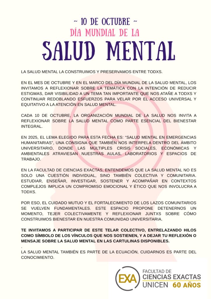En el marco del Día Mundial de la Salud Mental, la Facultad de Ciencias Exactas invita a participar de la inauguración del telar colectivo y muestra […]