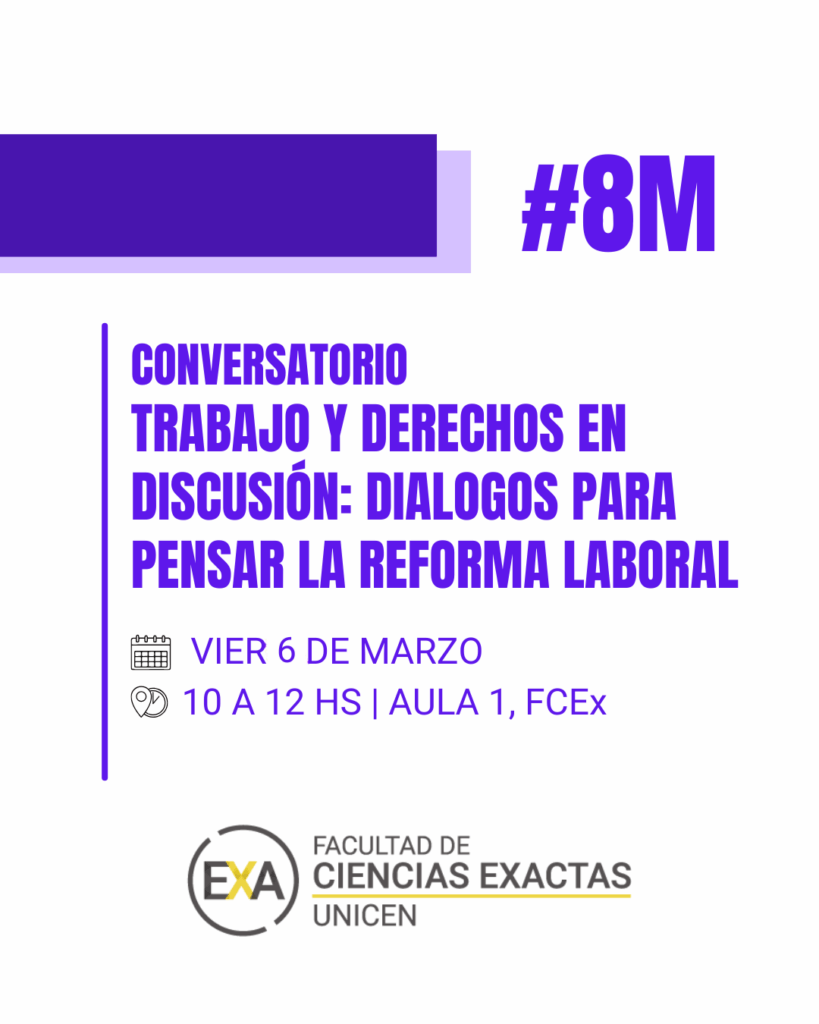 En el marco del 8M – Día Internacional de la Mujer Trabajadora, la Facultad de Ciencias Exactas invita a toda la comunidad a participar del conversatorio “Trabajo y derechos en discusión: DIÁLOGOS para pensar la reforma laboral”, un espacio de intercambio y reflexión colectiva en torno al presente y el futuro del trabajo.