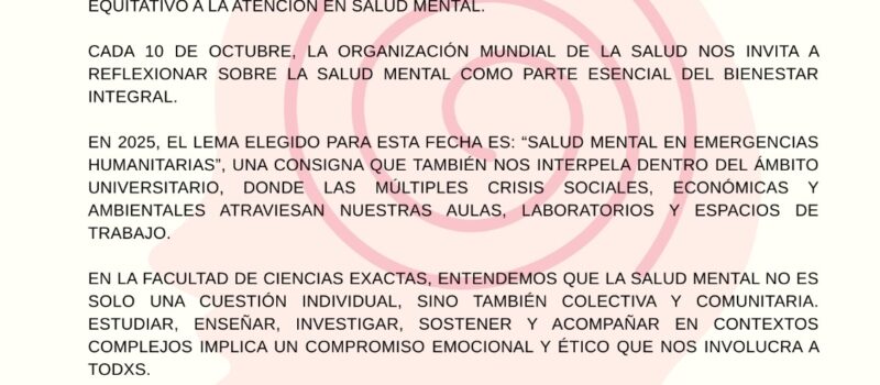 En el marco del Día Mundial de la Salud Mental, la Facultad de Ciencias Exactas invita a participar de la inauguración del telar colectivo y muestra participativa sobre salud mental, una propuesta para reflexionar, compartir y tejer comunidad, entrelazando hilos y mensajes sobre cómo cuidarnos en lo cotidiano.