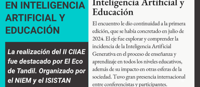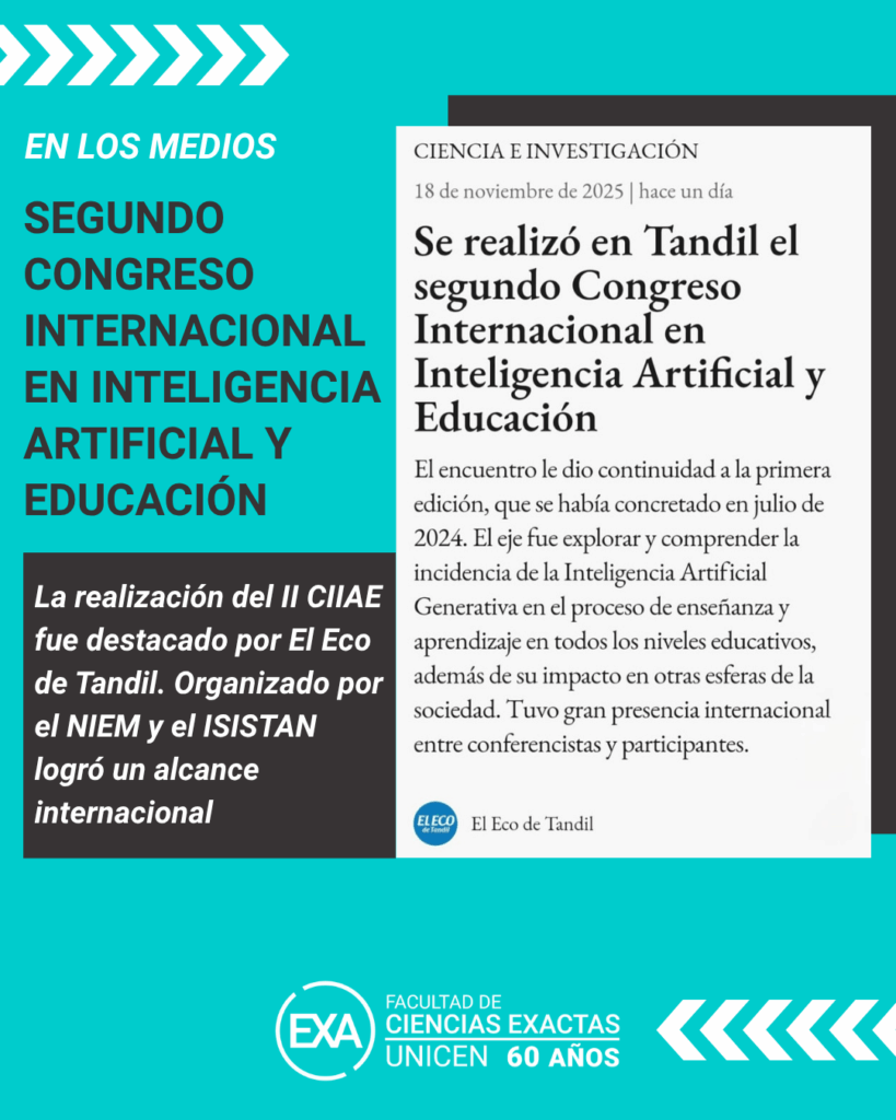 Les compartimos la nota publicada en El Eco de Tandil acerca del reciente 2° Congreso Internacional en Inteligencia Artificial y Educación (2CIIAE), que tuvo lugar del 12 al 14 de noviembre de 2025 en nuestra Facultad de Ciencias Exactas.
