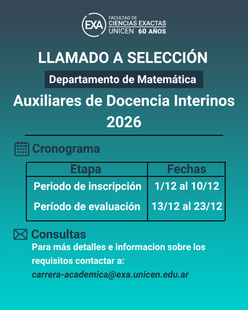 Desde la Facultad de Ciencias Exactas les adjuntamos el siguiente llamado a selección de auxiliares de docencia interinos para el año 2026.