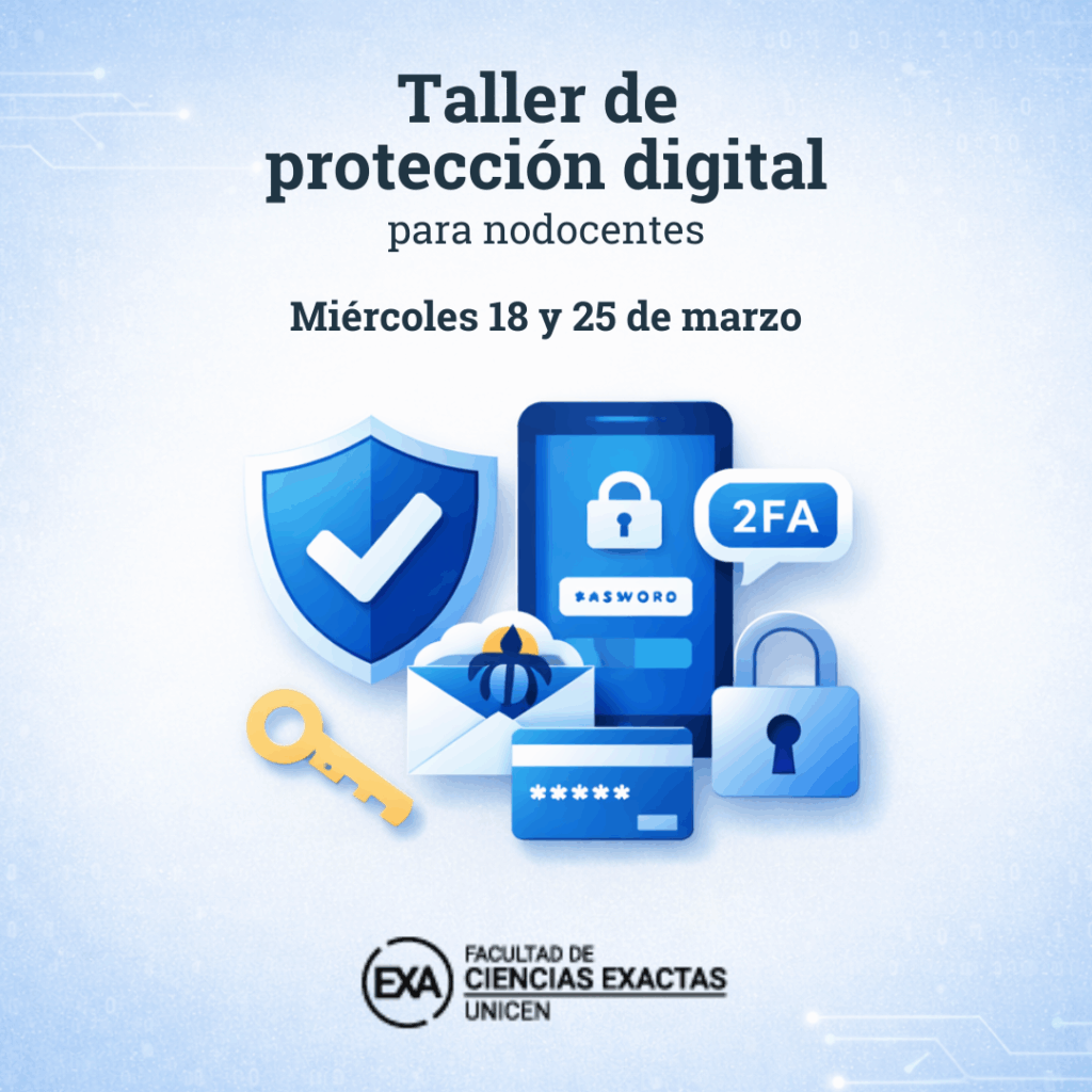 La Facultad de Ciencias Exactas invita al personal nodocente a participar del Taller de Protección Digital, una propuesta orientada a fortalecer la seguridad en el uso cotidiano de herramientas y servicios digitales. El taller se desarrollará los miércoles 18 y 25 de marzo.