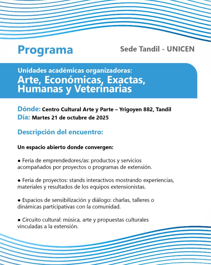 Del 20 al 24 de octubre, la Universidad Nacional del Centro de la Provincia de Buenos Aires (UNICEN) llevará adelante una nueva edición de la Semana de la Extensión, una propuesta que pone en valor el compromiso social de la universidad y su vínculo permanente con las comunidades de Tandil, Olavarría, Azul y Quequén.