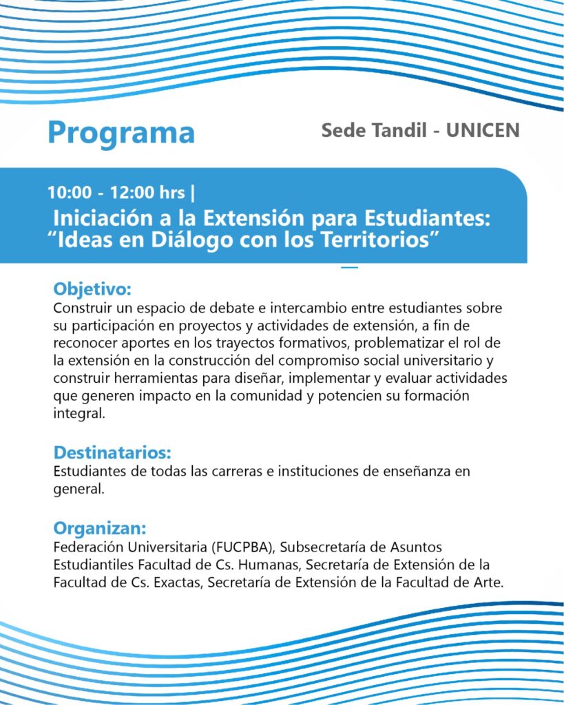 Desde la Facultad de Ciencias Exactas invitamos a estudiantes, docentes, personal nodocente y a la comunidad en general a sumarse a esta iniciativa que promueve la participación, el encuentro y el fortalecimiento de la extensión universitaria en la UNICEN.